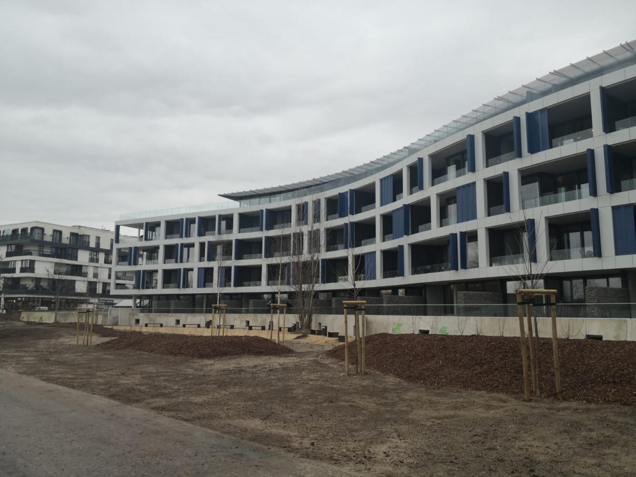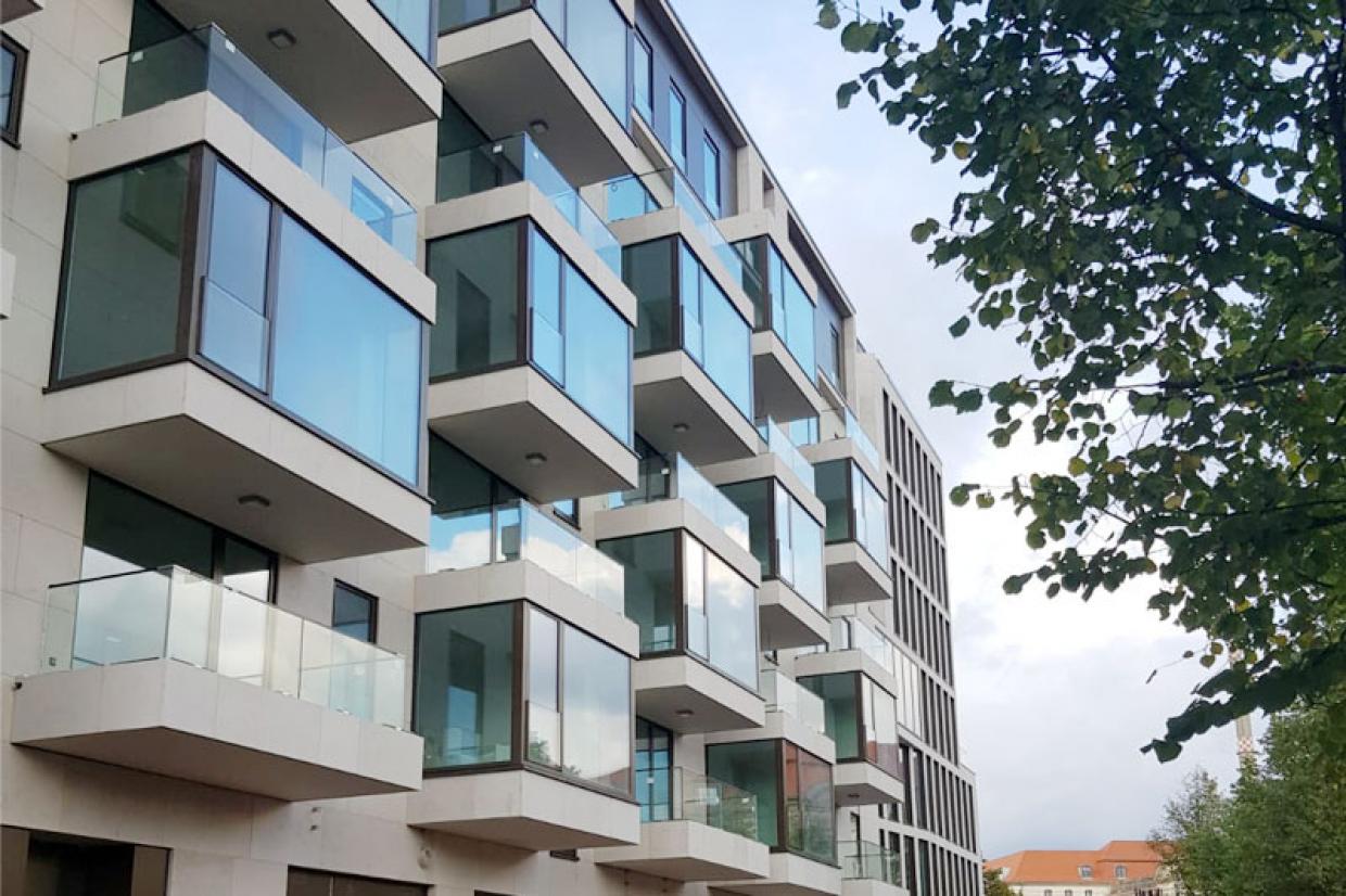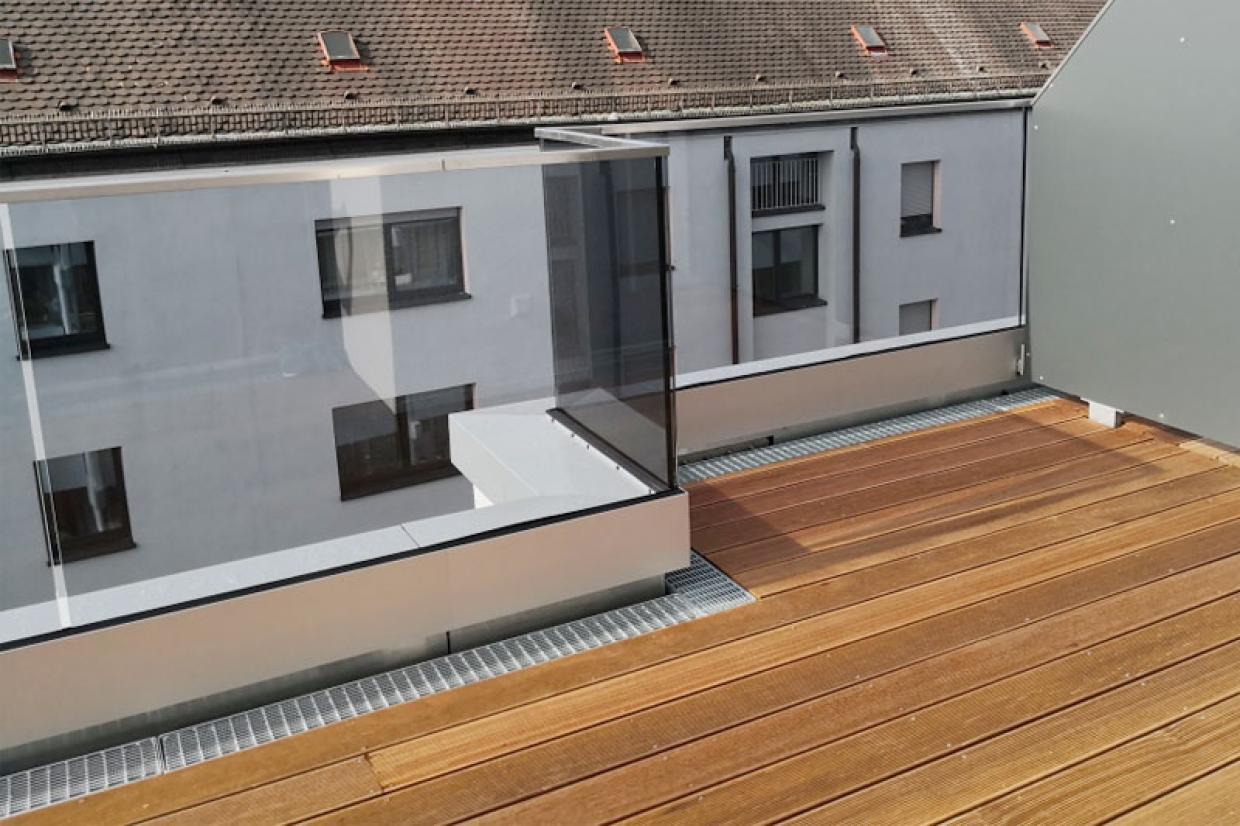 90 m Ganzglasgeländer mit Aufmaß, Planung, Montage, System Balardo Core an Holz-Attika, mit grauem Glas, Abdichtung und individueller Außenverblendung.
